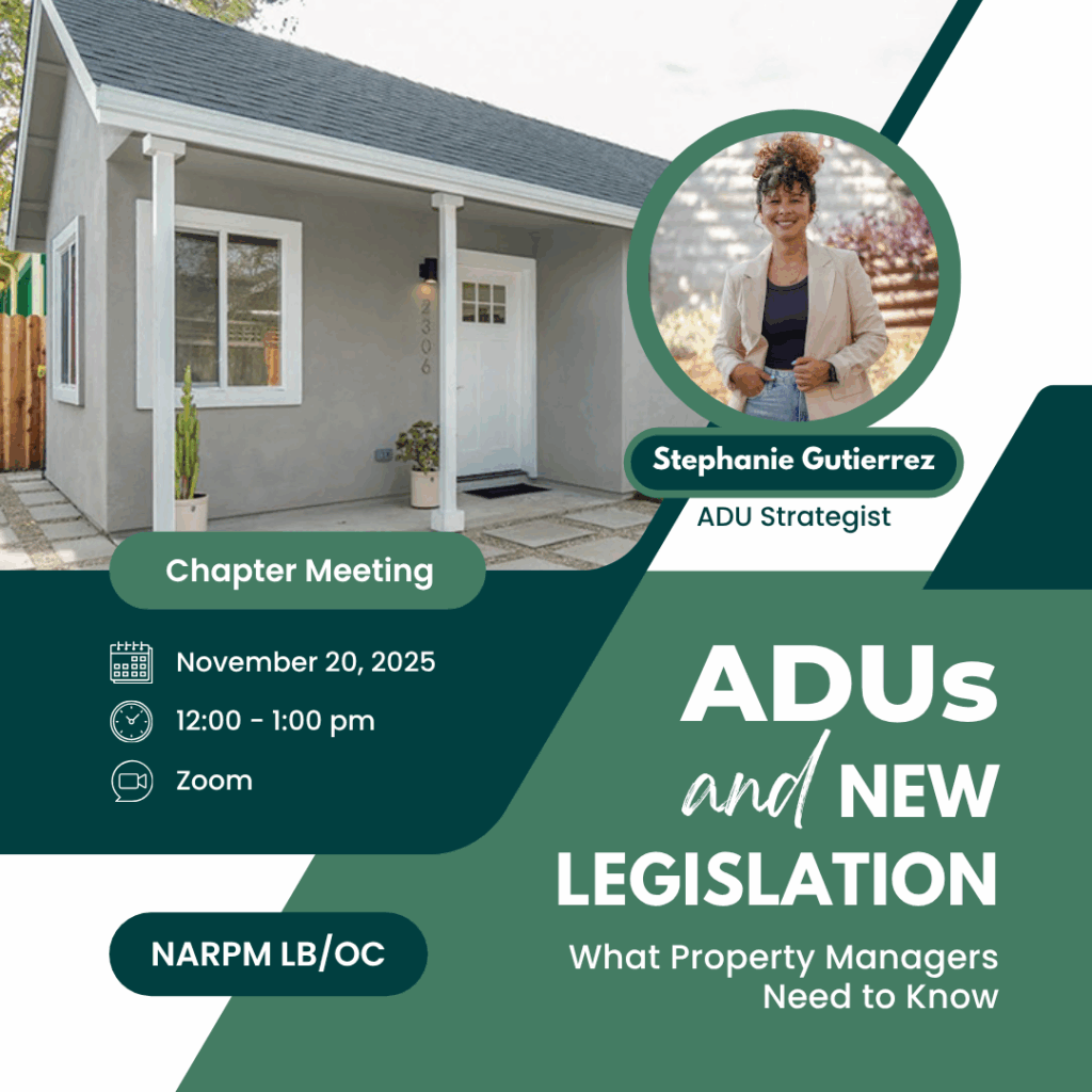 Join us for our November Chapter Meeting as we dive into Accessory Dwelling Units (ADUs) and the latest laws and updates impacting property managers and housing professionals.